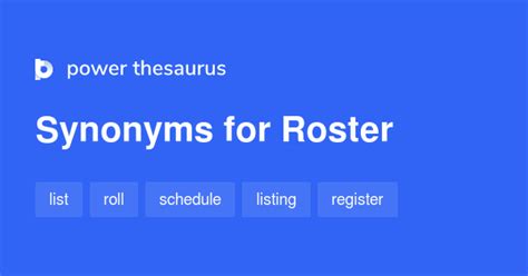 Lists, listings, schedules, catalogs, directories, catalogues, registers, registries, rolls, checklists List, listing, catalog, catalogue, registry, directory, schedule, register, roll, checklist Lists, listings, schedules, catalogs, directories, catalogues, registers, registries, rolls, checklists That meaning is still in use, but today, a roster is more likely to be a list of players on your favorite team, a list of. Web find 439 synonyms for roster and other similar words that you can use instead based on 5 separate contexts from our thesaurus. Web on this page you'll find 35 synonyms, antonyms, and words related to roster, such as: Agenda, inventory, record, schedule, table, and catalog. Web the word roster originally meant a list of the names, duties, and schedule of members of the military.